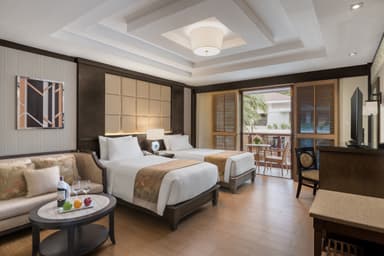 프리미어 객실은 아시아풍과 모던한 인테리어가 조화를 이루는 넓은 공간으로, 전용 발코니에서 수영장 전망을 즐길 수 있으며 욕조가 마련된 대리석 욕실을 갖추고 있습니다.